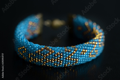 © Talulla, Fototapeta premium Beaded bracelet blue color with golden pattern on a dark background close up