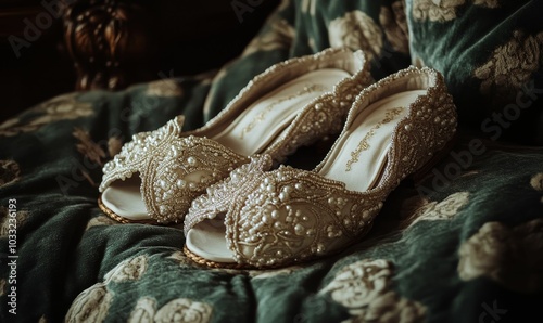 © jambulart, Naklejka premium Beaded sandals on a patterned fabric.