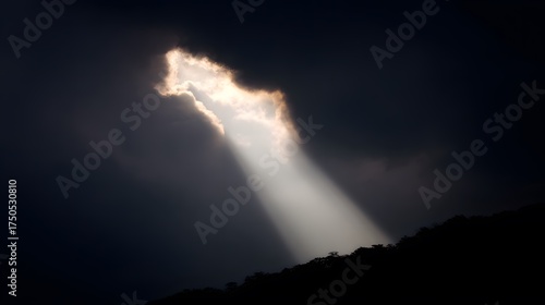 Obraz premium Beam of sunlight breaking through dark storm clouds, illuminating the ground.