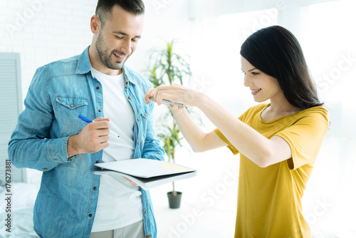 © Viacheslav Yakobchuk, Obraz premium Beaming lady taking photos of notes indoors