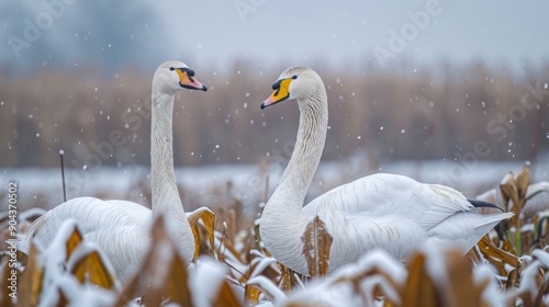 © FryArt, Fototapeta premium Bean goose and whooper swan wintering on cornfield