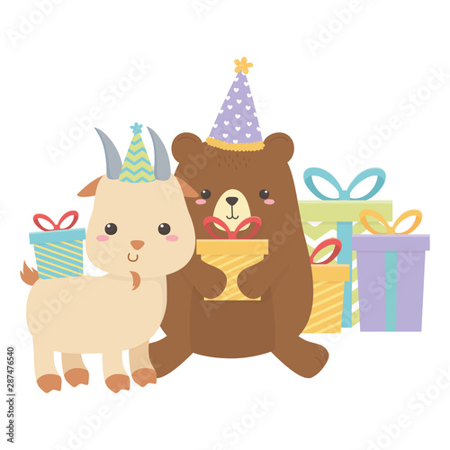 © Stockgiu, Naklejka premium Bear and goat with happy birthday icon design