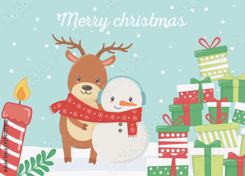 © Stockgiu, Fototapeta premium bear and snowman with scarf gifts celebration merry christmas poster