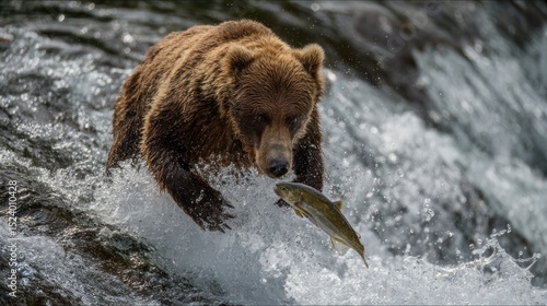Obraz premium Bear catching salmon in river