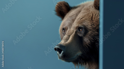 © ds17, Fototapeta premium bear close-up, peeking out from behind a wooden vertical board, on a blue background, banner, space for text. AI generated