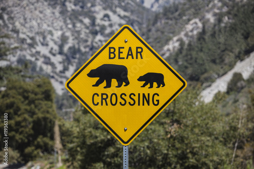 Fototapeta premium Bear Crossing Highway Sign with National Forest Background