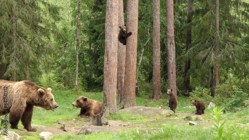Obraz premium Bear family with Cubs on the ground and climbing in the woods/nature of Finland