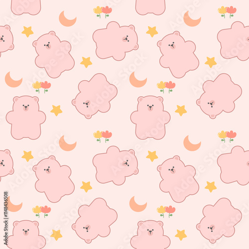 Obraz premium Bear pink cartoon so cute. On flower moon star pink background. Pattern seamless vector illustration.