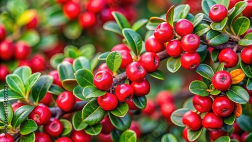 © Songkran, Obraz premium Bearberry Cotoneaster Fruits, evergreen shrubs for fall, coniferous evergreen shrub