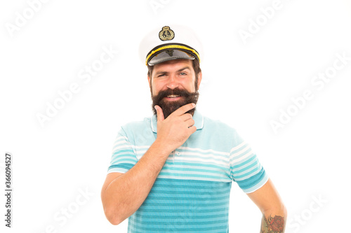 © be free, Fototapeta premium Beard rule. Happy sailor with hipster beard. Bearded man in navy uniform isolated on white. Barbershop. Beard barber. Beard grooming. Sea voyage. Marine adventure. Lets go sailing