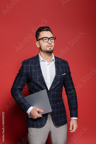 Fototapeta premium bearded businessman in blazer and glasses holding laptop on red.