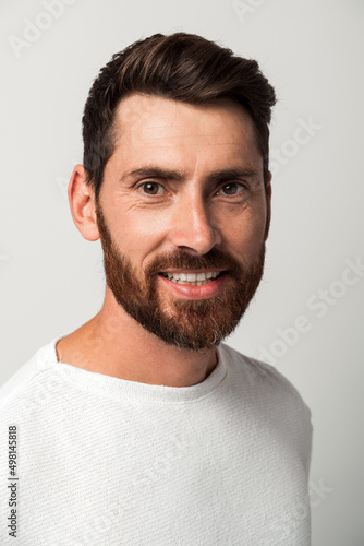 © speed300, Obraz premium Bearded handsome man in casual style looking at the camera and smiling while posing