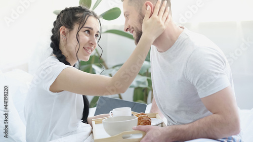 Obraz premium bearded man bringing breakfast to pretty girlfriend with braids in bed.