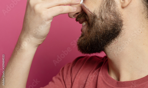© lashkhidzetim, Obraz premium Bearded man holding pippete with beard oil.
