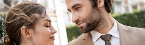 Obraz premium bearded man in suit looking at smiling bride outdoors, banner.