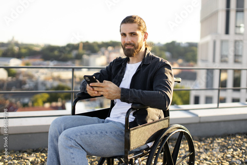 Obraz premium Bearded man in wheelchair using smartphone on urban rooftop, embracing technology and positivity.