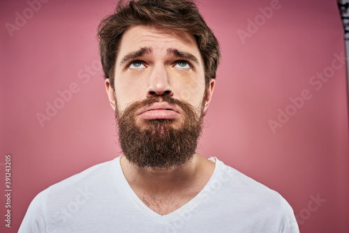 Fototapeta premium bearded man in white t-shirt emotions displeased facial expression studio pink background