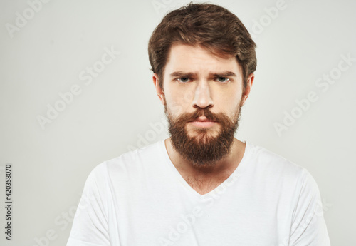 Obraz premium Bearded man in white T-shirt puzzled look sad face cropped look