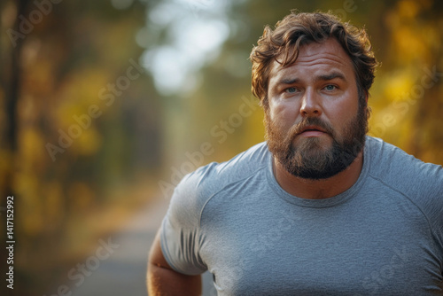 © sofiko14, Obraz premium Bearded man jogging outdoors in autumn forest wearing a gray sports shirt