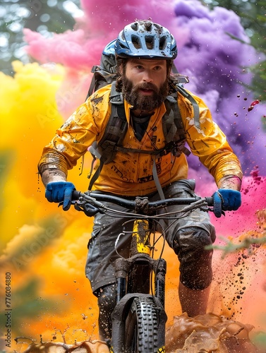 Fototapeta premium Bearded Man Riding Bike in Colorful Powder Explosion