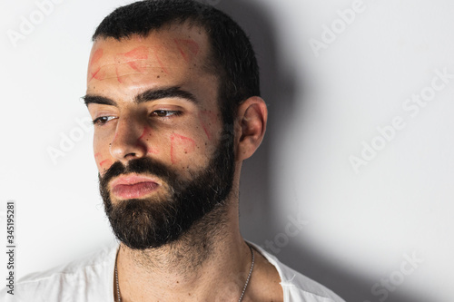 Obraz premium Bearded man with traces of lipstick on his face