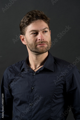 © be free, Naklejka premium Bearded man with unshaven face, barbershop. Bachelor with stylish hair, haircut. Guy in fashionable shirt, fashion. Hair care in beauty salon, barbershop. Mens fashion, style and trend