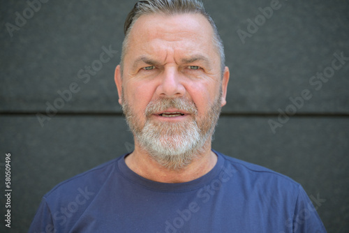 © michaelheim, Obraz premium Bearded middle aged man staring at camera in consternation