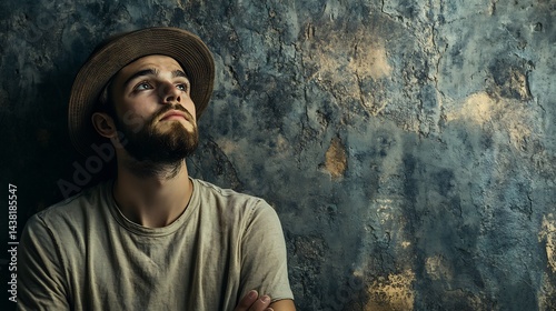 © Dot, Obraz premium Bearded Young Adult In a Hat Standing With a Thoughtful Expression Against a Textured Industrial Wall