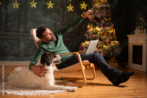 Obraz premium bearded young man with dog at christmastime