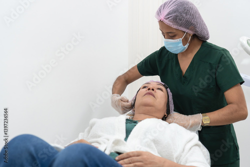 © Hector Pertuz, Obraz premium Beautician preparing patient for facial treatment in beauty clinic