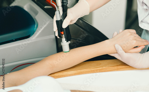 © Peakstock, Fototapeta premium beautician removes hair on beautiful female hands using a laser. hair removal on the hands, laser procedure at clinic