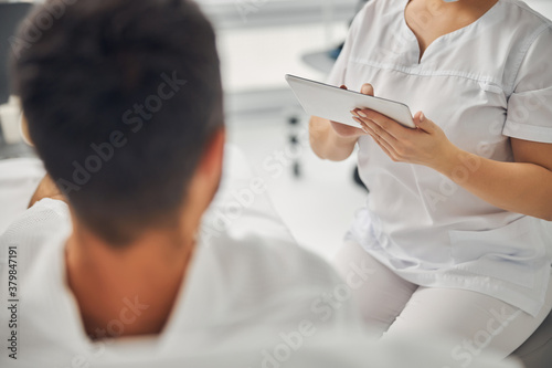 Fototapeta premium Beautician using tablet computer and talking with male client