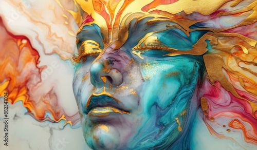 © Nika, Fototapeta premium Beautiful abstract female face with a colorful wing, in the fantasy style, with gold and marble colors, on an alcohol ink background, a detailed illustration, dreamy, ethereal.