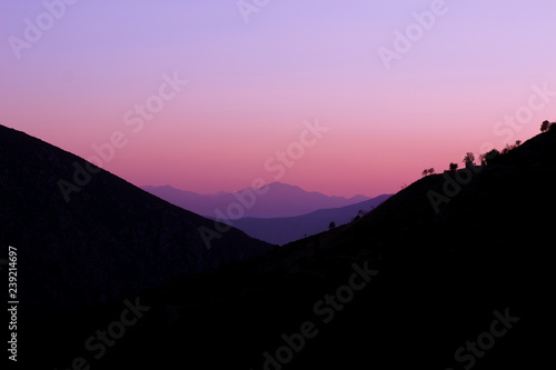 Fototapeta premium beautiful abstract nature sunset landscape with pink evening light between symmetry mountain range silhouettes, wallpaper background pattern concept with empty space for copy or your text