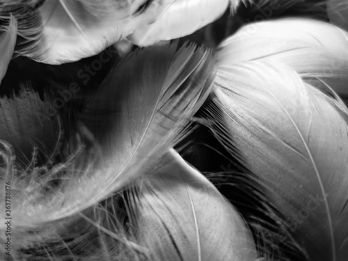 © Weerayuth, Obraz premium Beautiful abstract white feathers on black background and soft black feather texture on white pattern and light background, gray feather background, gray banners