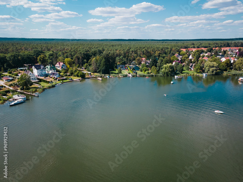 © arianarama, Fototapeta premium Beautiful aerial view of lake Peetzsee at Grünheide, Germany and boats on water