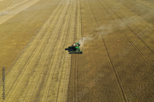 Obraz premium Beautiful aerial view of modern combine harvester working in field on sunny...