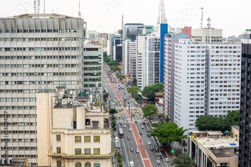 © Imago Photo, Fototapeta premium Beautiful aerial view of Paulista avenue, Sao Paulo city skyline. Street cityscape with modern buildings and car traffic. Concept of architecture, urban, metropolis, Brazil, South America.