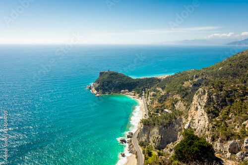 Fototapeta premium Beautiful aerial view of Saraceni Bay beach from Sentiero del Pellegrino, Liguria, Italy