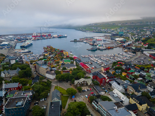 © Gian, Obraz premium Beautiful aerial view of the City of Torshavn Capital of Faroe Islands- View of Cathedral, colorful buildings, marina, suburbs and Flag