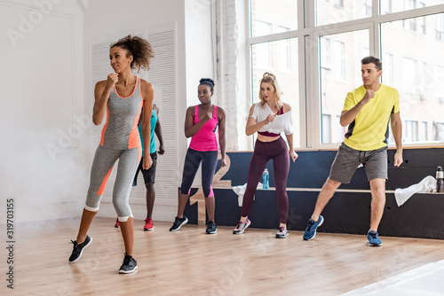Fototapeta premium Beautiful african american trainer performing zumba movements with...