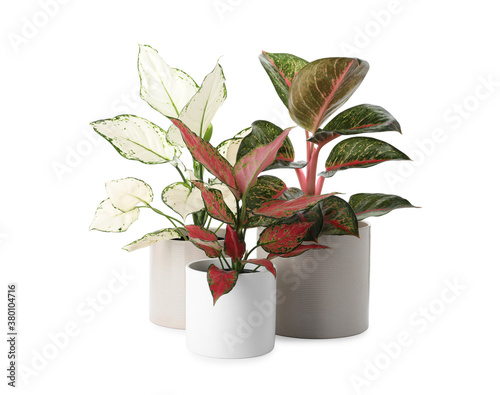 Fototapeta premium Beautiful Aglaonema plants in flowerpots isolated on white. House decor