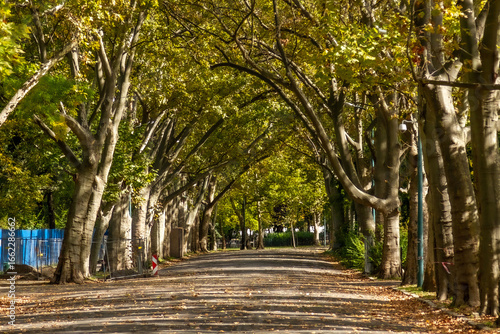 © Vlad Rakin, Naklejka premium Beautiful alley in Városliget City Park with plane trees forming a natural canopy, sunlight filtering through yellowing leaves creating patterns on fallen foliage. Budapest, Hungary.