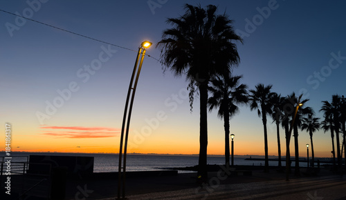 Naklejka premium beautiful alley with palm trees aerial view, pedestrian street at sunset...
