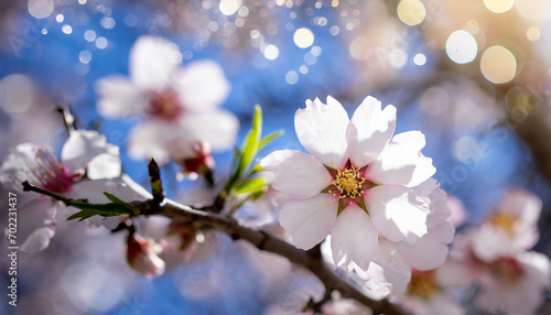 © Uranzaya, Fototapeta premium Beautiful almonds flower with bokeh background