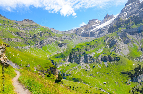 Naklejka premium Beautiful Alpine landscape photographed in summer season. Hiking path surrounded by rocks, mountains and green pastures. Swiss Alps in summer. Switzerland landscape. Kandersteg area