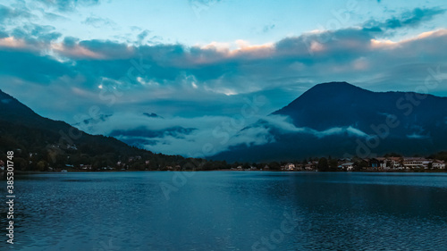 Naklejka premium Beautiful alpine sunset view with Rottach-Egern in the background at the famous Tegernsee, Bavaria, Germany