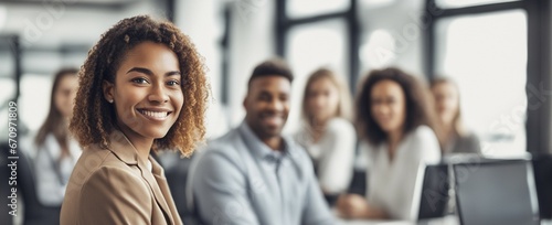 © SkyFrame Creations, Obraz premium Beautiful American woman good employee nice fashion half body eye contact and background empty space for design in USA