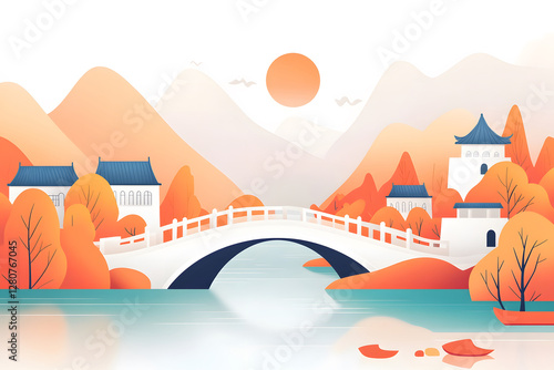 Naklejka premium Beautiful ancient bridge verandah Chinese style hand-painted illustrations,...