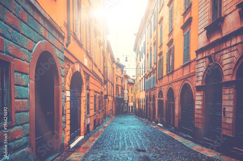 Fototapeta premium beautiful and ancient buildings in a street with warm sunlight in the middle